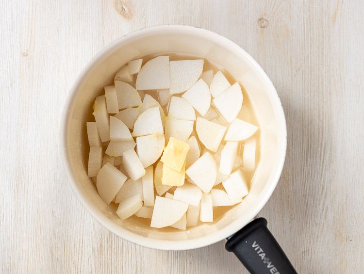 1. 大根は皮をむいて厚さ3cmの半月切りにする。