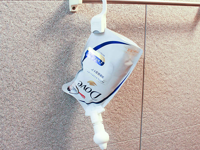 ボディソープの詰め替え作業も面倒な家事のひとつなので、わが家では「詰め替えそのまま」というグッズを使って詰め替え用を吊るして使用しています。