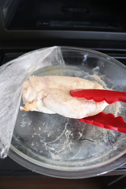 1. 耐熱容器に鶏胸肉を置き、フォークなどで両面をそれぞれ数か所刺す。