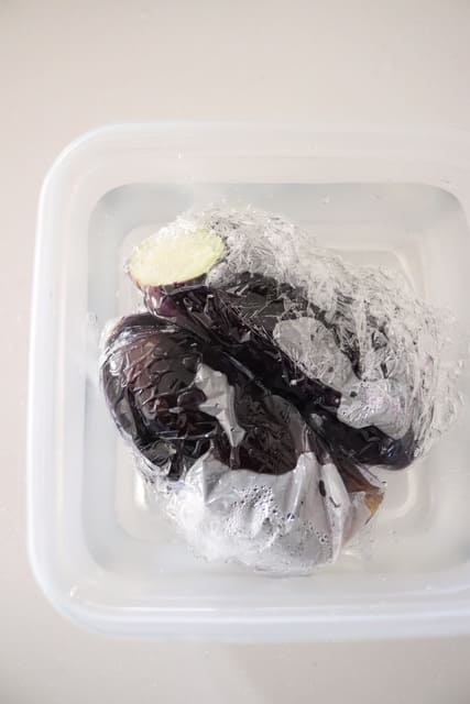 ①茄子をラップに包んで深さのある耐熱容器に並べ、600wのレンジで3分30秒加熱する。(手で押して柔らかくなっていたらOK)